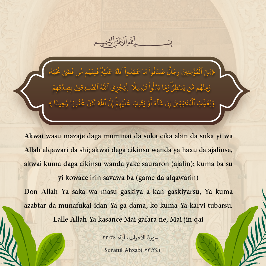 Akwai wasu mazaje daga muminai da suka cika abin da suka yi wa Allah alqawari da shi; akwai daga cikinsu wanda ya haxu da ajalinsa, akwai kuma daga cikinsu wanda yake sauraron (ajalin); kuma ba su yi kowace irin savawa ba (game da alqawarin)(23)Don Allah Ya saka wa masu gaskiya a kan gaskiyarsu, Ya kuma azabtar da munafukai idan Ya ga dama, ko kuma Ya karvi tubarsu. Lalle Allah Ya kasance Mai gafara ne, Mai jin qai