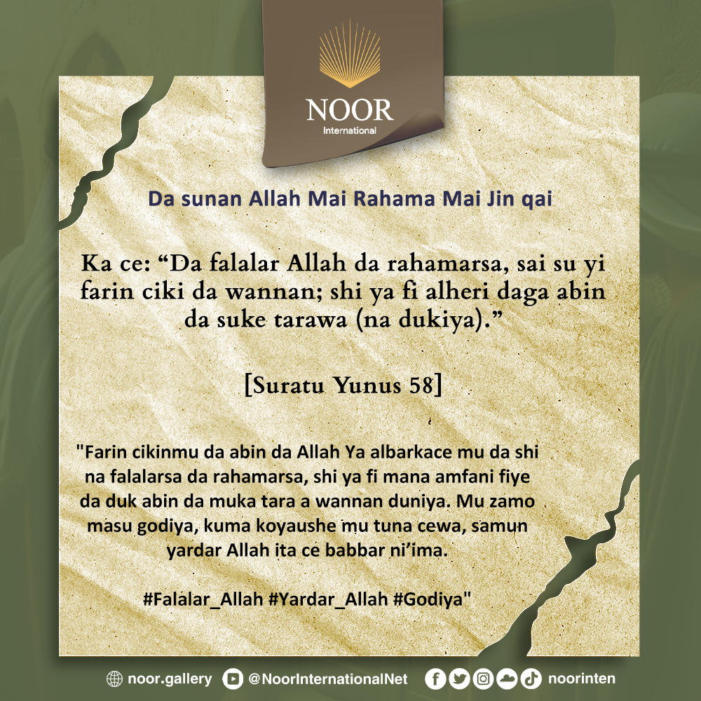 Farin cikinmu da abin da Allah Ya albarkace mu da shi na falalarsa da rahamarsa, shi ya fi mana amfani fiye da duk abin da muka tara a wannan duniya. Mu zamo masu godiya, kuma koyaushe mu tuna cewa, samun yardar Allah ita ce babbar ni’ima. #Falalar_Allah #Yardar_Allah #Godiya"