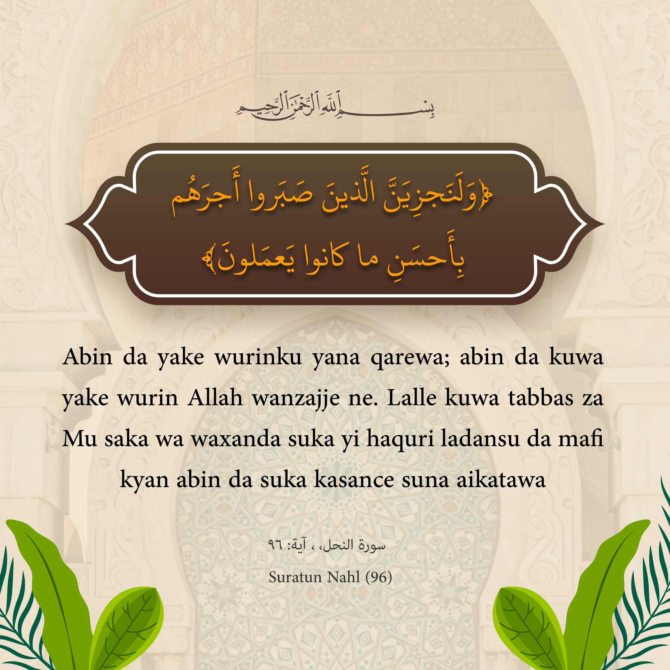 abin da kuwa yake wurin Allah wanzajje ne. Lalle kuwa tabbas za Mu saka wa waxanda suka yi haquri ladansu da mafi kyan abin da suka kasance suna aikatawa
