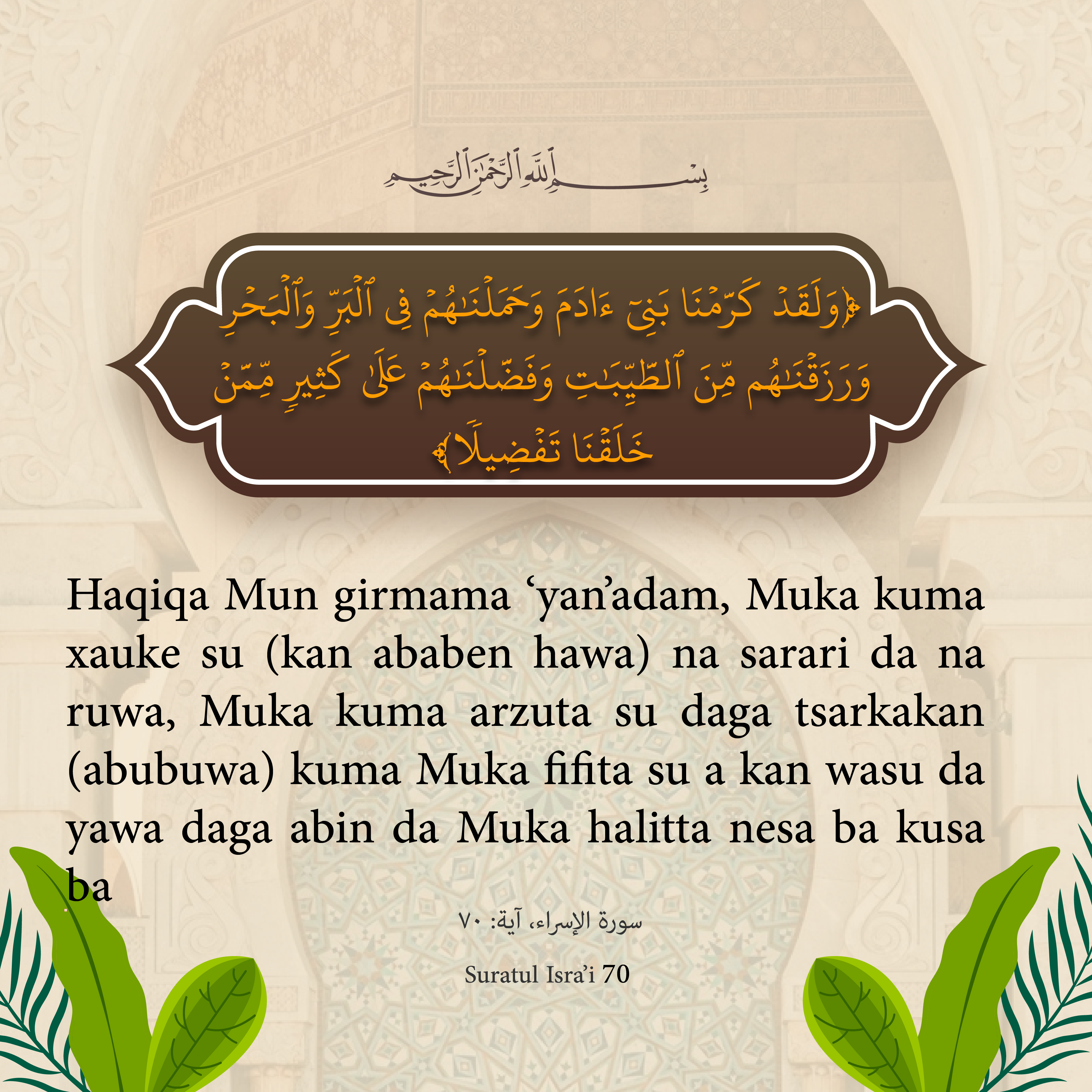 Haqiqa Mun girmama ‘yan’adam, Muka kuma xauke su (kan ababen hawa) na sarari da na ruwa, Muka kuma arzuta su daga tsarkakan (abubuwa) kuma Muka fifita su a kan wasu da yawa daga abin da Muka halitta nesa ba kusa ba