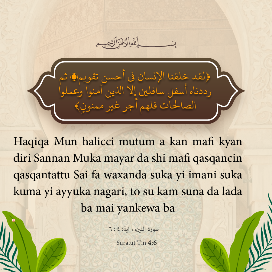 Haqiqa Mun halicci mutum a kan mafi kyan diri,Sannan Muka mayar da shi mafi qasqancin qasqantattu, Sai fa waxanda suka yi imani suka kuma yi ayyuka nagari, to su kam suna da lada ba mai yankewa ba