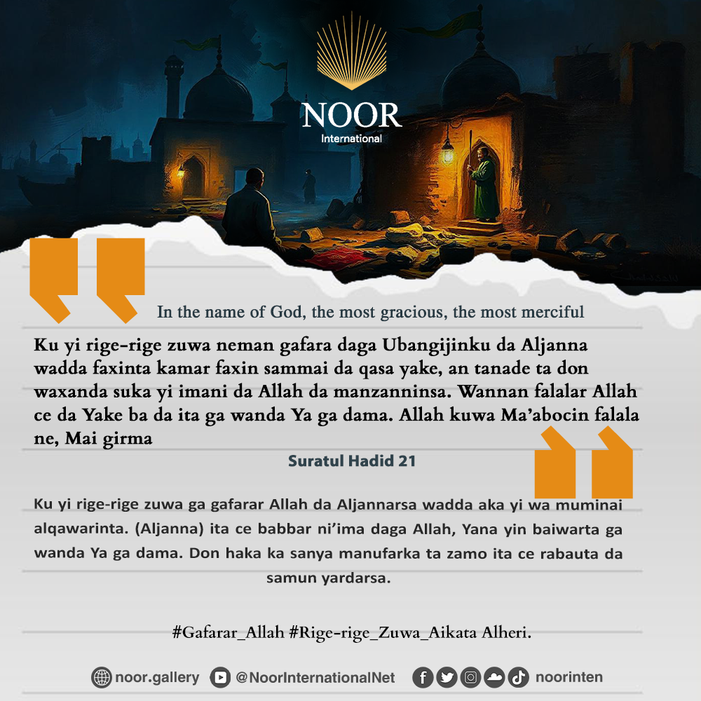 Ku yi rige-rige zuwa ga gafarar Allah da Aljannarsa wadda aka yi wa muminai alqawarinta. (Aljanna) ita ce babbar ni’ima daga Allah, Yana yin baiwarta ga wanda Ya ga dama. Don haka ka sanya manufarka ta zamo ita ce rabauta da samun yardarsa.