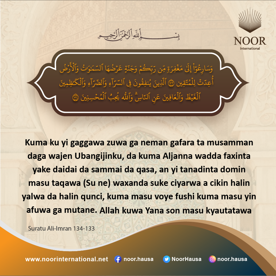 kuma ku yi gaggawa zuwa ga neman gafara ta musamman daga wajen Ubangijinku, da kuma Aljanna wadda faxinta yake daidai da sammai da qasa, an yi tanadinta domin masu taqawa