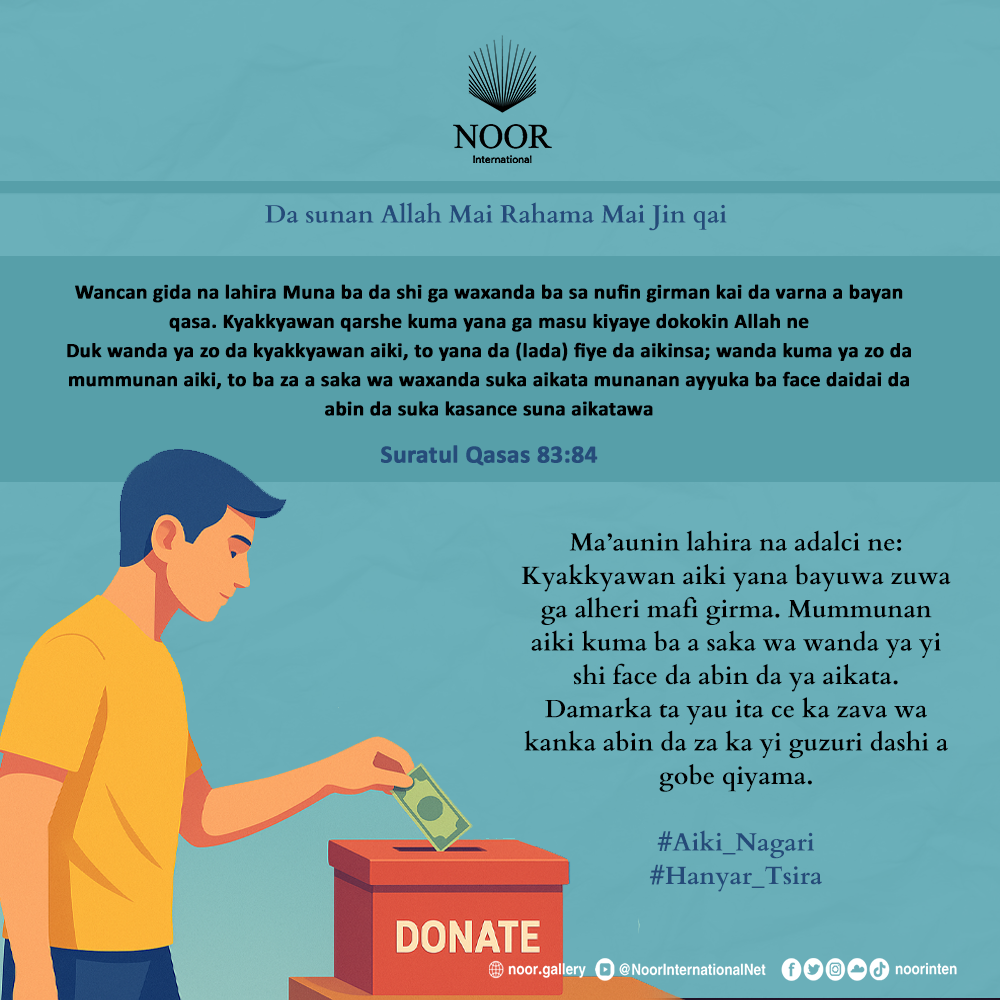 Ma’aunin lahira na adalci ne: Kyakkyawan aiki yana bayuwa zuwa ga alheri mafi girma. Mummunan aiki kuma ba a saka wa wanda ya yi shi face da abin da ya aikata. Damarka ta yau ita ce ka zava wa kanka abin da za ka yi guzuri dashi a gobe qiyama.