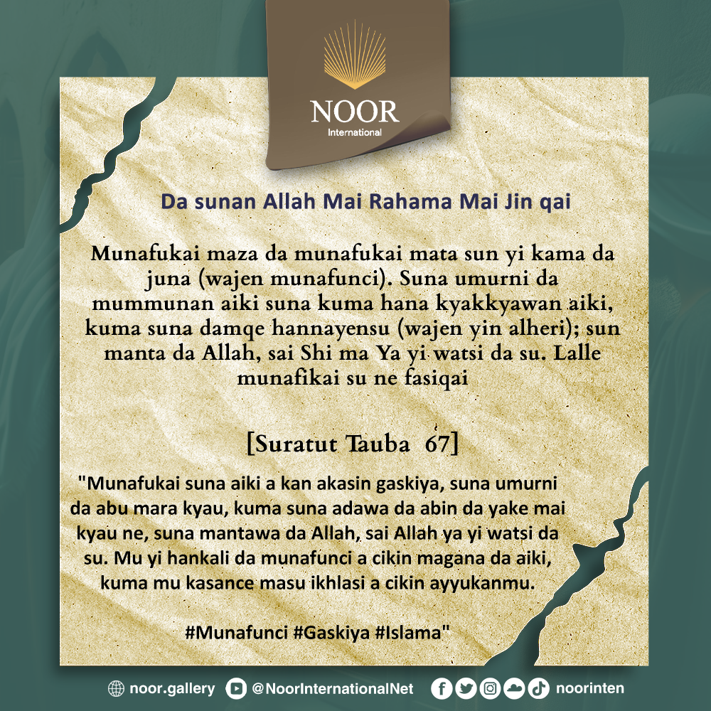 Munafukai suna aiki a kan akasin gaskiya, suna umurni da abu mara kyau, kuma suna adawa da abin da yake mai kyau ne, suna mantawa da Allah, sai Allah ya yi watsi da su. Mu yi hankali da munafunci a cikin magana da aiki, kuma mu kasance masu ikhlasi a cikin ayyukanmu. #Munafunci #Gaskiya #Islama"