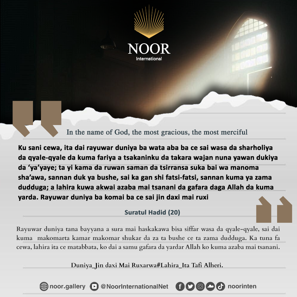 Rayuwar duniya tana bayyana a sura mai haskakawa bisa siffar wasa da qyale-qyale, sai dai kuma  makomarta kamar makomar shukar da za ta bushe ce ta zama dudduga. Ka tuna fa cewa, lahira ita ce matabbata, ko dai a samu gafara da yardar Allah ko kuma azaba mai tsanani.