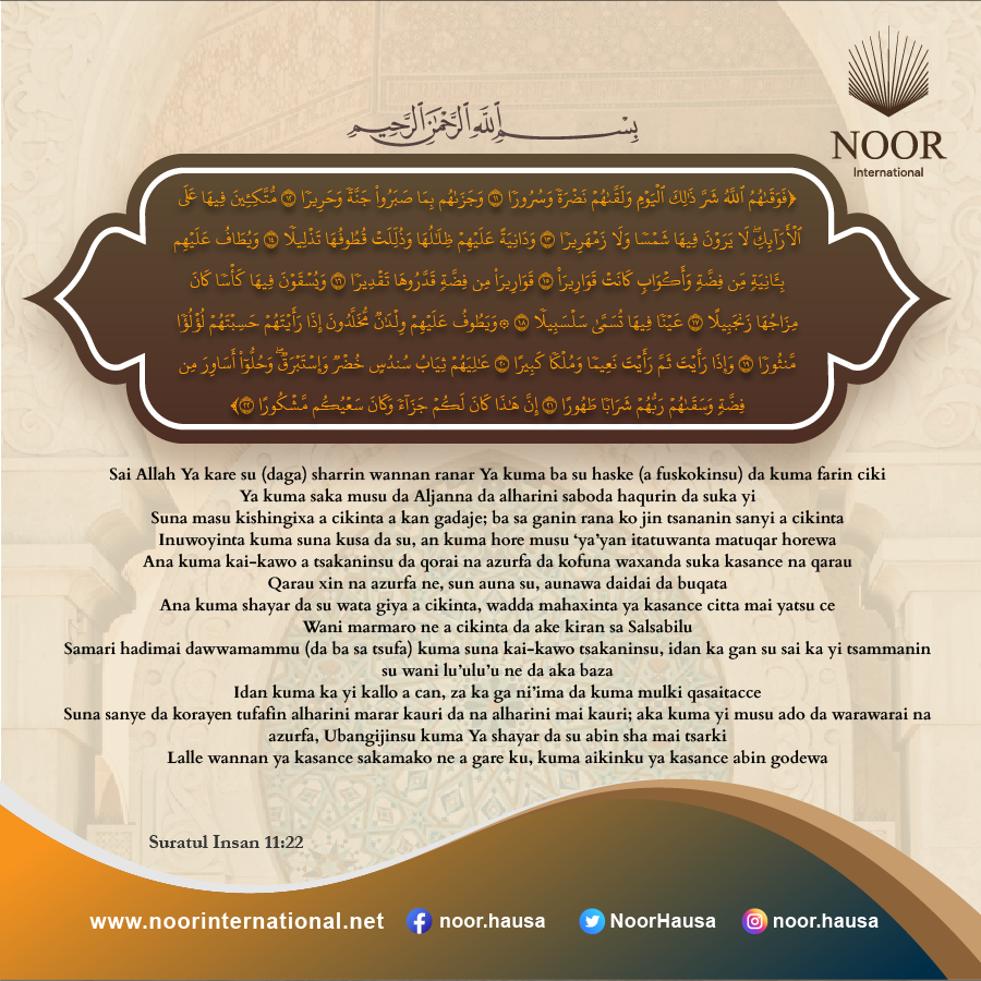 Sai Allah Ya kare su (daga) sharrin wannan ranar Ya kuma ba su haske (a fuskokinsu) da kuma farin ciki(12)Ya kuma saka musu da Aljanna da alharini saboda haqurin da suka yi(13)Suna masu kishingixa a cikinta a kan gadaje; ba sa ganin rana ko jin tsananin sanyi a cikint(14)Inuwoyinta kuma suna kusa da su, an kuma hore musu ‘ya’yan itatuwanta matuqar horewa(15)Ana kuma kai-kawo a tsakaninsu da qorai na azurfa da kofuna waxanda suka kasance na qarau(16)Qarau xin na azurfa ne, sun auna su, aunawa daidai da buqata(17)Ana kuma shayar da su wata giya a cikinta, wadda mahaxinta ya kasance citta mai yatsu ce(18)Wani marmaro ne a cikinta da ake kiran sa Salsabilu(19)Samari hadimai dawwamammu (da ba sa tsufa) kuma suna kai-kawo tsakaninsu, idan ka gan su sai ka yi tsammanin su wani lu’ulu’u ne da aka baza(20)Idan kuma ka yi kallo a can, za ka ga ni’ima da kuma mulki qasaitacce(21)Suna sanye da korayen tufafin alharini marar kauri da na alharini mai kauri; aka kuma yi musu ado da warawarai na azurfa, Ubangijinsu kuma Ya shayar da su abin sha mai tsarki(22)Lalle wannan ya kasance sakamako ne a gare ku, kuma aikinku ya kasance abin godewa