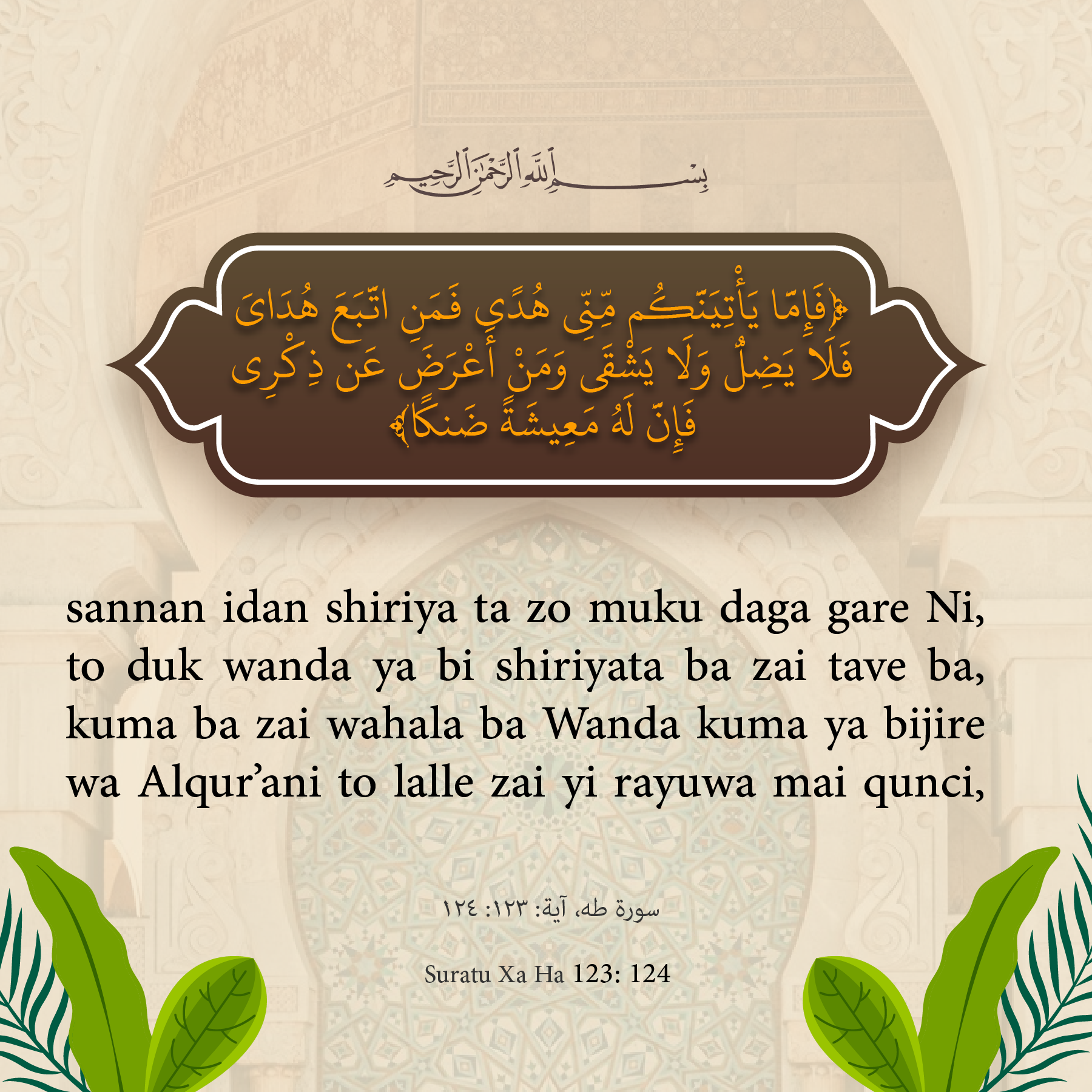 sannan idan shiriya ta zo muku daga gare Ni, to duk wanda ya bi shiriyata ba zai tave ba, kuma ba zai wahala ba,“Wanda kuma ya bijire wa Alqur’ani to lalle zai yi rayuwa mai qunci,