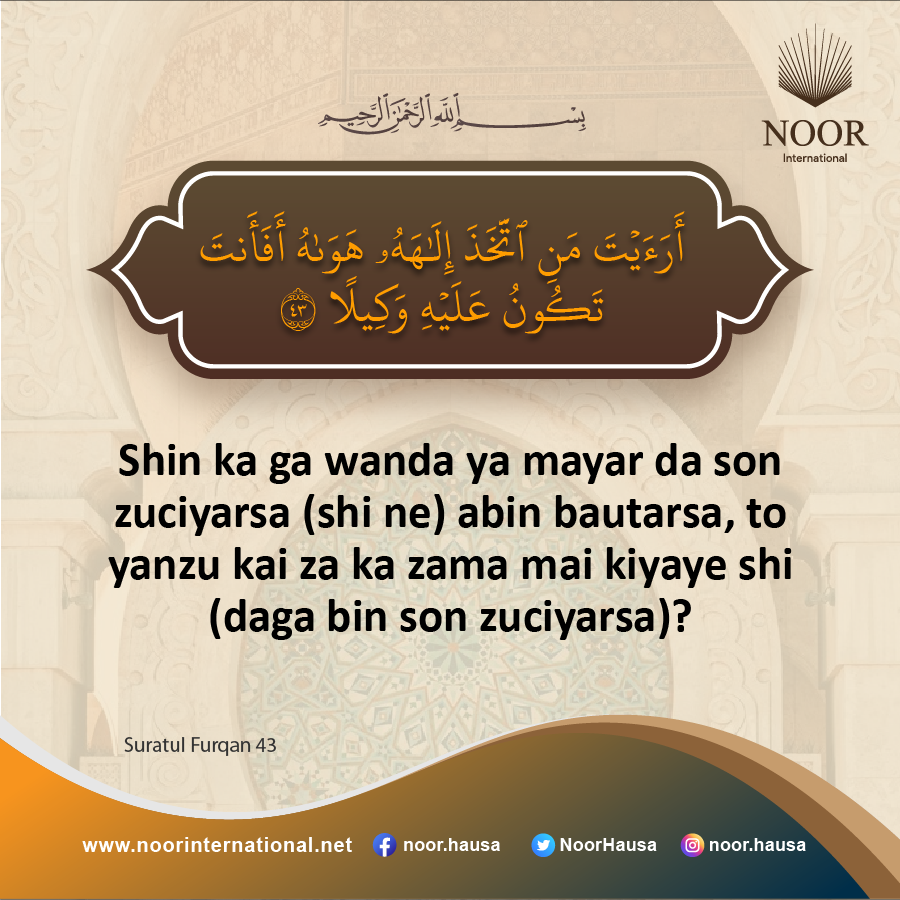 Shin ka ga wanda ya mayar da son zuciyarsa (shi ne) abin bautarsa, to yanzu kai za ka zama mai kiyaye shi (daga bin son zuciyarsa)?