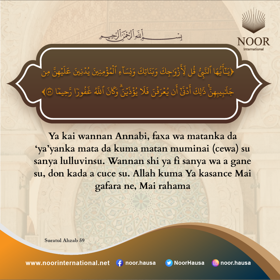 Ya kai wannan Annabi, faxa wa matanka da ‘ya’yanka mata da kuma matan muminai (cewa) su sanya lulluvinsu. Wannan shi ya fi sanya wa a gane su, don kada a cuce su. Allah kuma Ya kasance Mai gafara ne, Mai rahama