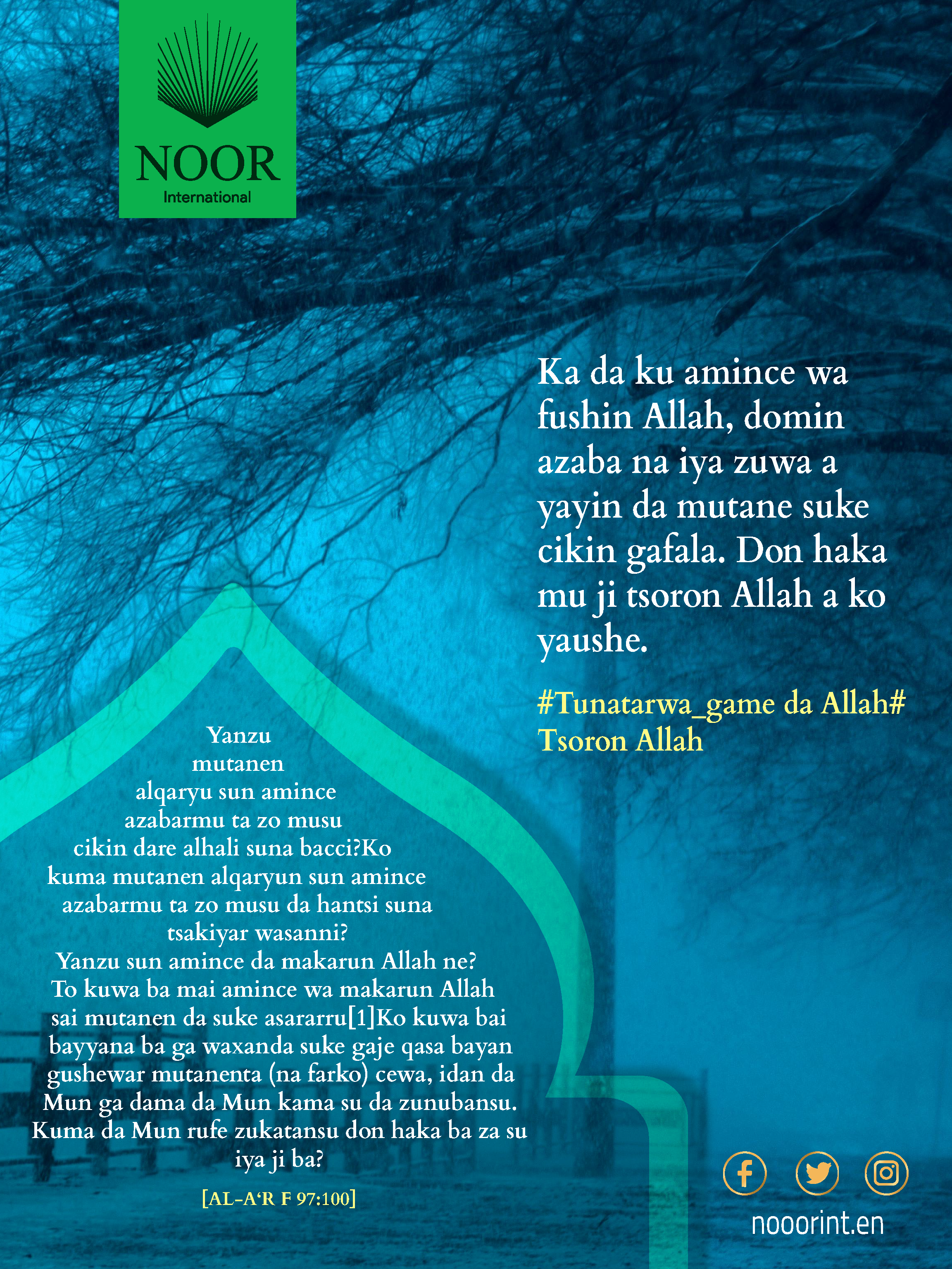 Ka da ku amince wa fushin Allah, domin azaba na iya zuwa a yayin da mutane suke cikin gafala. Don haka mu ji tsoron Allah a ko yaushe. #Tunatarwa_game da Allah# Tsoron Allah