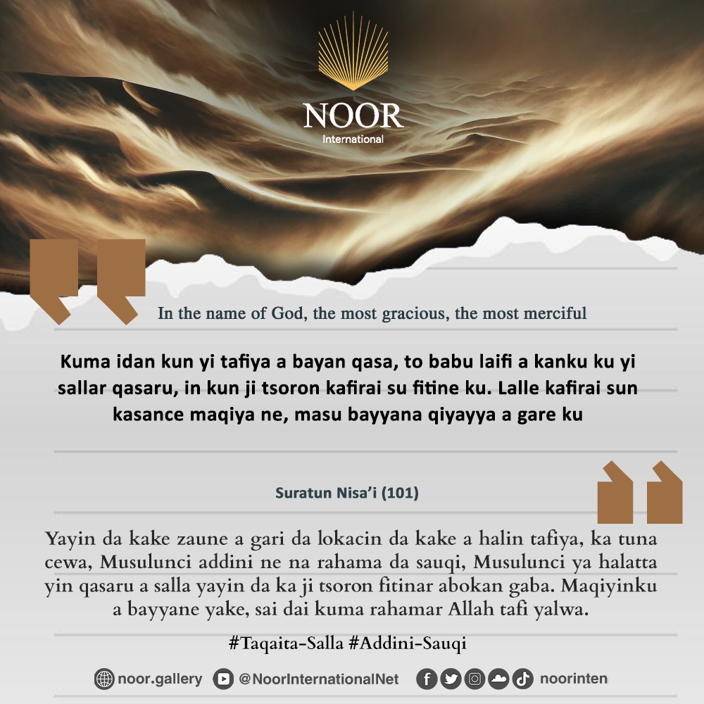Yayin da kake zaune a gari da lokacin da kake a halin tafiya, ka tuna cewa, Musulunci addini ne na rahama da sauqi, Musulunci ya halatta yin qasaru a salla yayin da ka ji tsoron fitinar abokan gaba. Maqiyinku a bayyane yake, sai dai kuma rahamar Allah tafi yalwa.