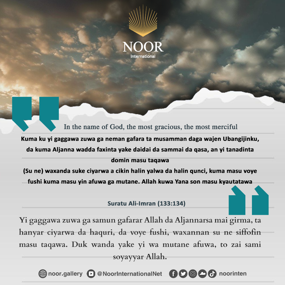 “Yi gaggawa zuwa ga samun gafarar Allah da Aljannarsa mai girma, ta hanyar ciyarwa da haquri, da voye fushi, waxannan su ne siffofin masu taqawa. Duk wanda yake yi wa mutane afuwa, to zai sami soyayyar Allah.”