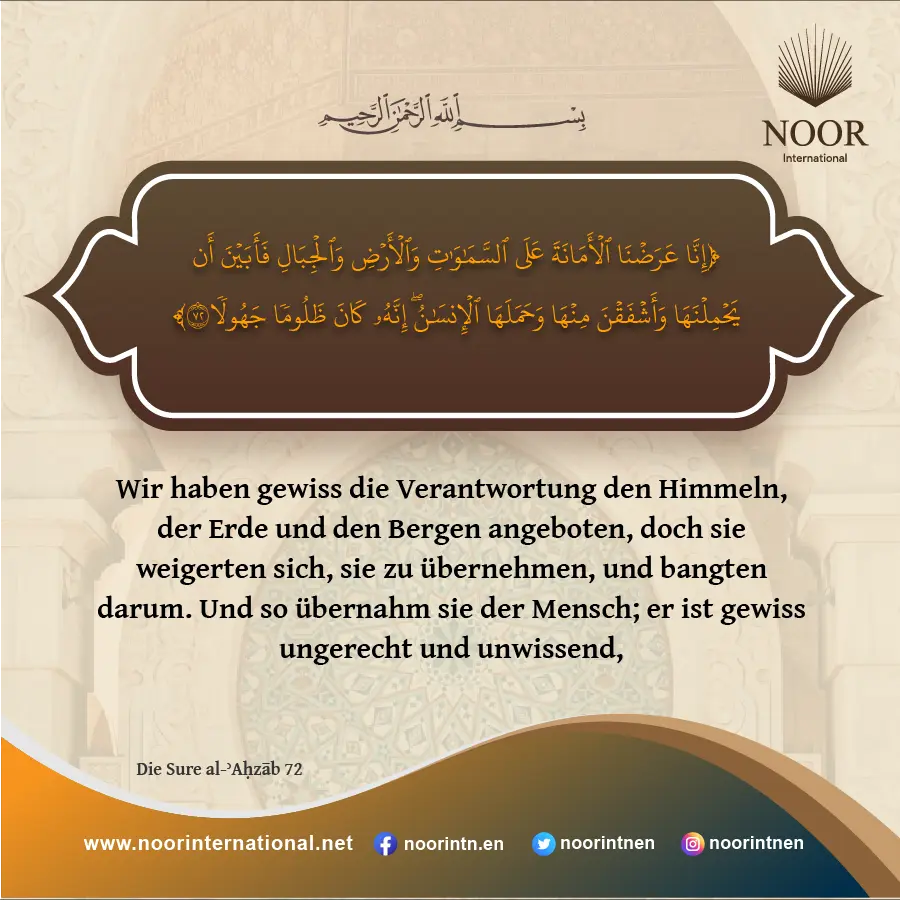 Betrachte die Größe des Vertrauens, das die Himmel, die Erde und die Berge fürchteten und ablehnten zu tragen... während der Mensch es annahm – doch er war sich selbst gegenüber ungerecht und unwissend über die Folgen seiner Entscheidung. Ehrlichkeit ist eine große Verantwortung, die Allah den großen Geschöpfen anbot, doch sie lehnten ab – während der Mensch es wagte, sie zu tragen! Erkennen wir wirklich die Vertrauenspflichten, die wir um unseren Hals tragen?