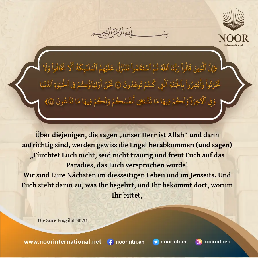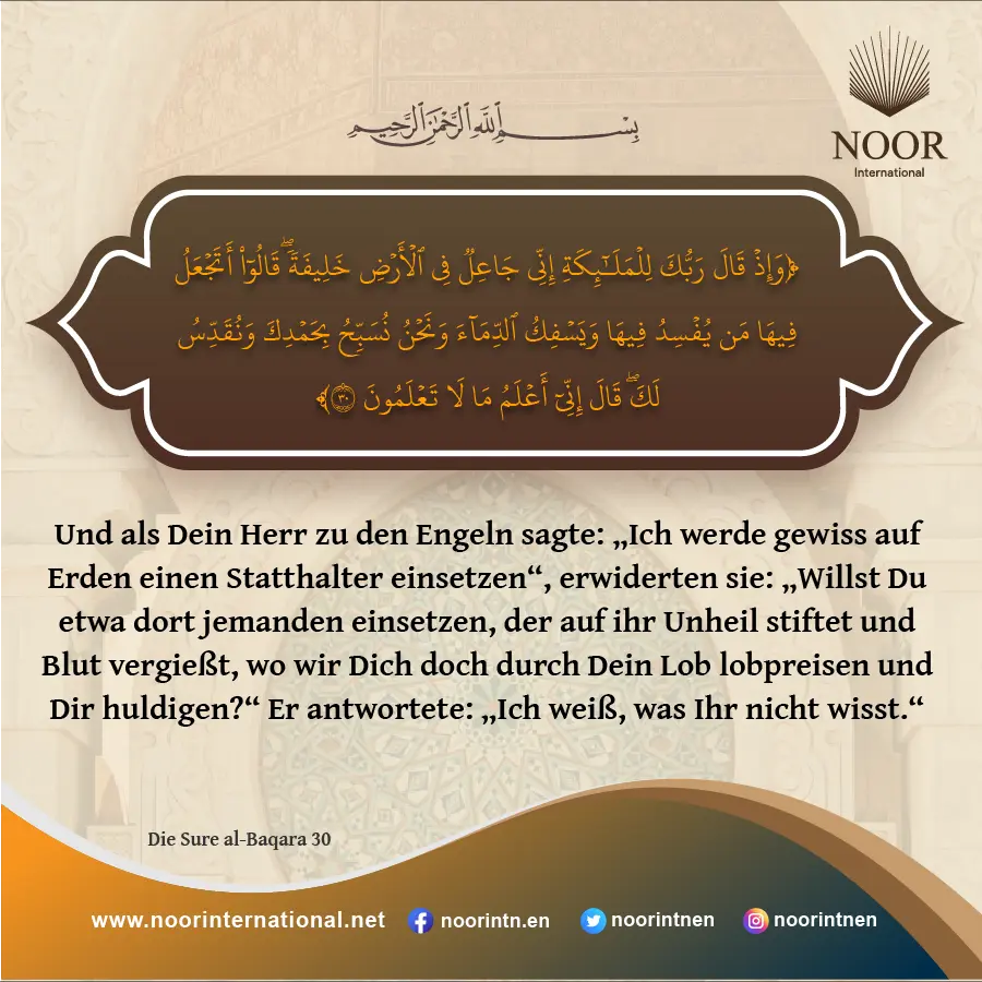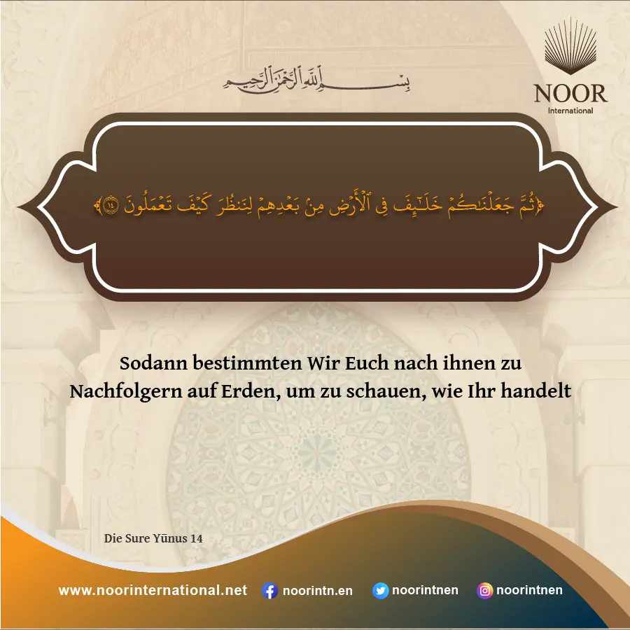 Das Kalifat auf Erden ist eine Verantwortung, nicht nur eine Ehre. Der Mensch wurde erschaffen, um die Erde zu bevölkern, nicht um sie zu verderben, um Gerechtigkeit zu etablieren, nicht um Blut zu vergießen. Sei ein wahrer Kalif, so wie Gott es für dich bestimmt hat. Entscheidend ist nicht deine Position, sondern was du daraus machst. Du wurdest für eine große Mission erschaffen. Wirst du zu den Reformern gehören oder zu denen, die Verderben stiften? Du bist ein Kalif auf Erden... also verrate dein anvertrautes Gut nicht.
