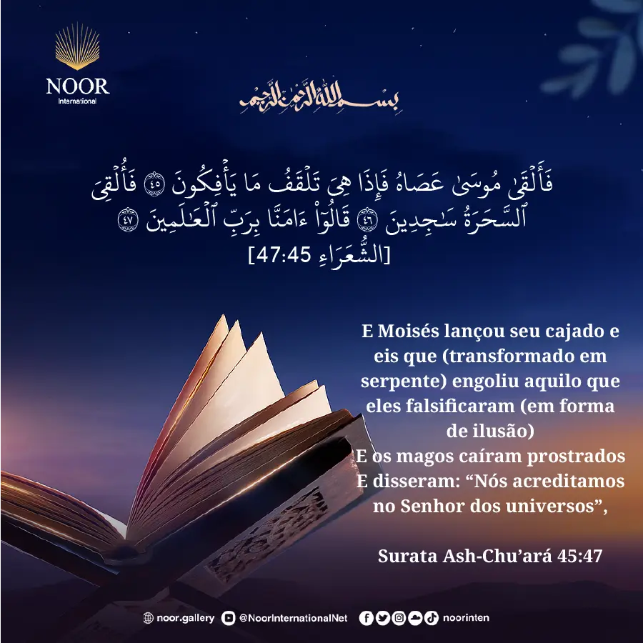 {E Moisés lançou seu cajado e eis que (transformado em serpente) engoliu aquilo que eles falsificaram (em forma de ilusão). E os magos caíram prostrados. E disseram: “Nós acreditamos no Senhor dos universos”} [Alcorão 26:45-47]