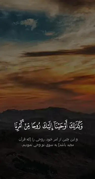 (و اين چنين از امر خود روحی را [كه قرآن مجيد باشد] به سوى تو وحی نموديم. تو [پیش از نزول قرآن] نمیدانستی كهکتاب چیست؟ و ایمان چیست؟ ولی ما آن را نوری قرار دادیم، که به وسیله آن هر که از بندگان خود را خواسته باشيم هدایت میکنیم. وبه يقين تو [مردم] به راه راست هدایت مینمايى.