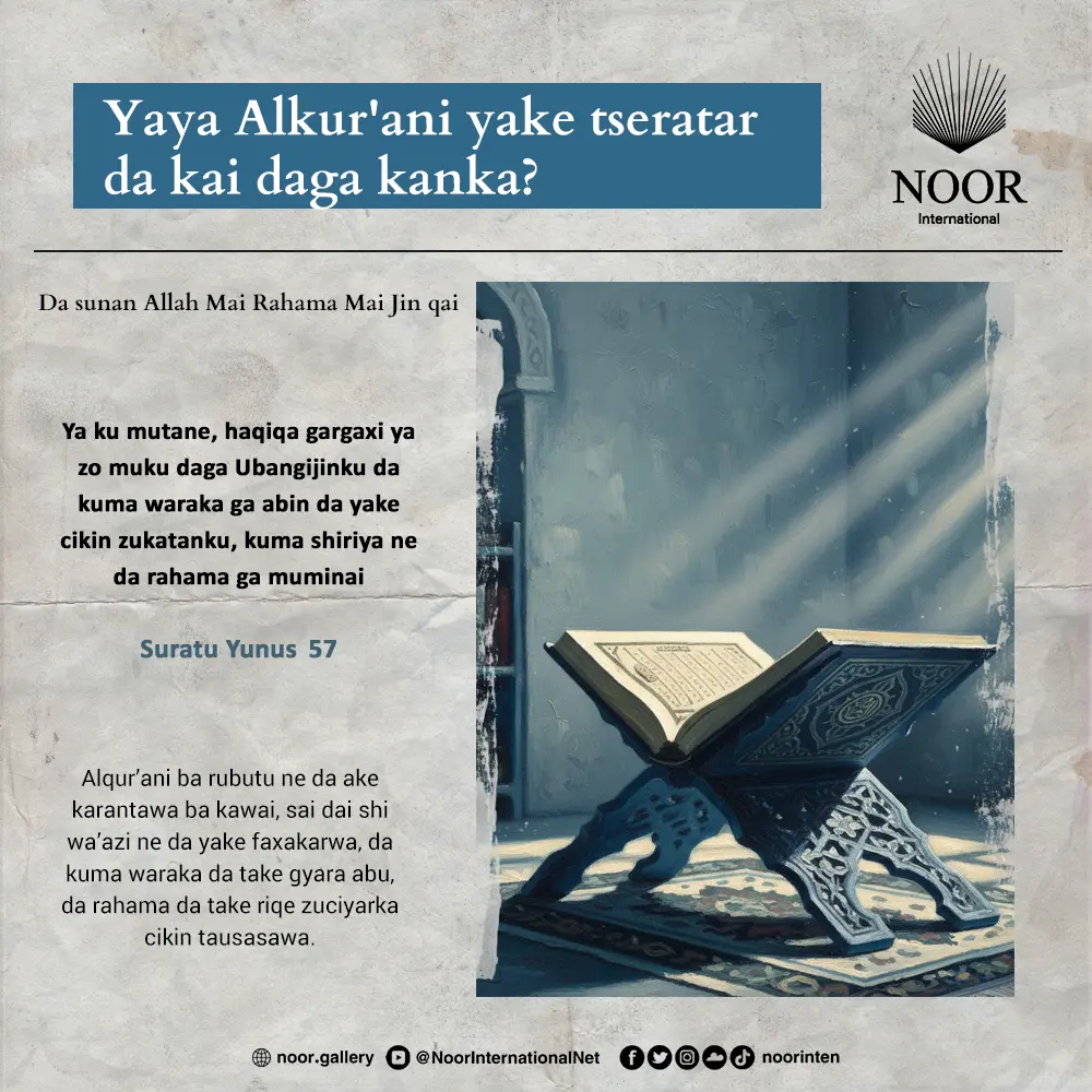 Alqur’ani ba rubutu ne da ake karantawa ba kawai, sai dai shi wa’azi ne da yake faxakarwa, da kuma waraka da take gyara abu, da rahama da take riqe zuciyarka cikin tausasawa.