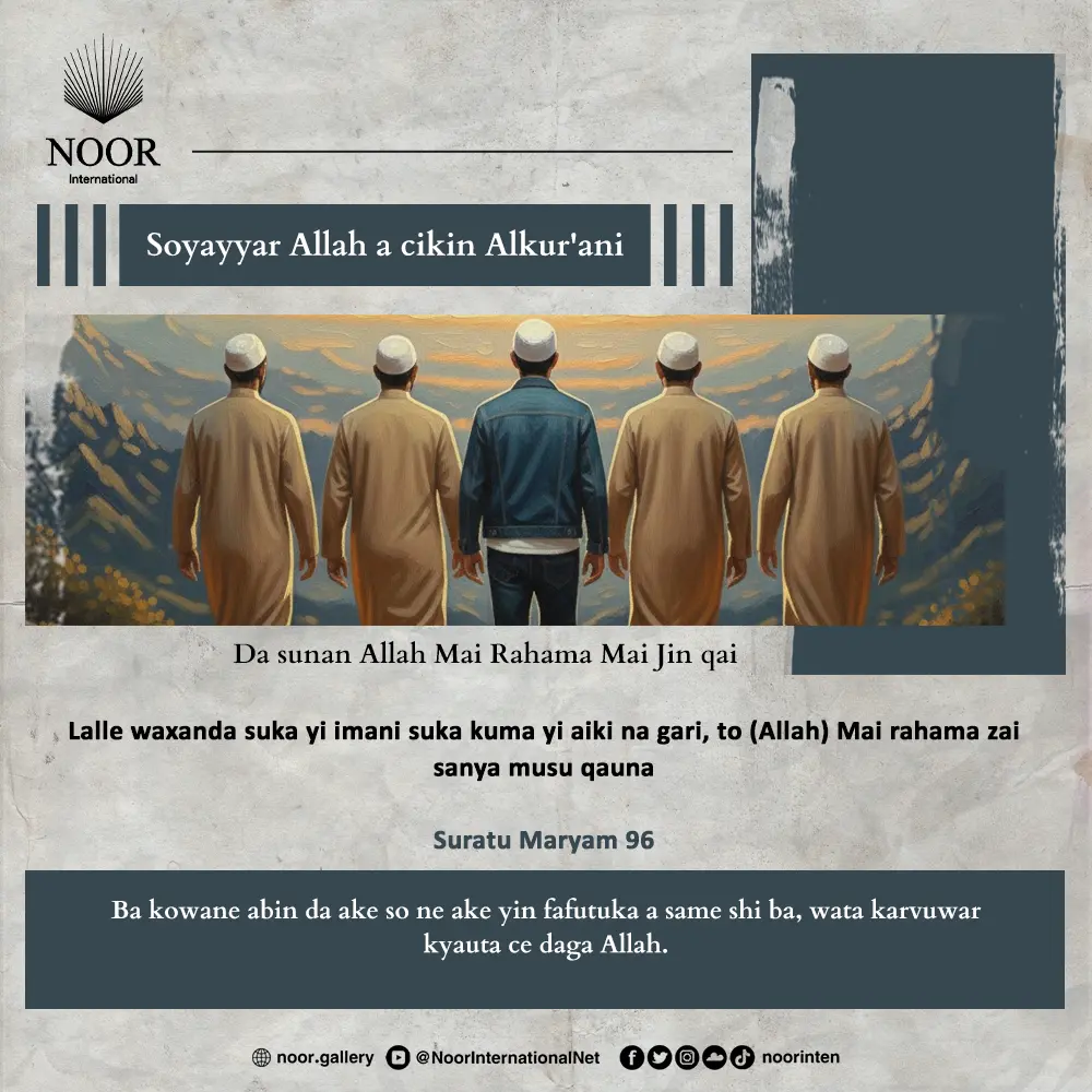 Ya ku waxanda suka yi imani, duk wanda ya yi ridda daga cikinku, ya bar addininsa, to (ya sani) Allah zai kawo waxansu mutane da Yake son su suna son Sa, suna masu qasqantar da kai ga muminai, suna masu nuna wa kafirai isa, suna yin jihadi don xaukaka kalmar Allah, kuma ba sa jin tsoron zargin wani mai zargi. Wannan falalar Allah ce da Yake bayar da ita ga wanda Ya ga dama. Kuma Allah Mayalwaci ne, Masani. [Ma’ida: 54]