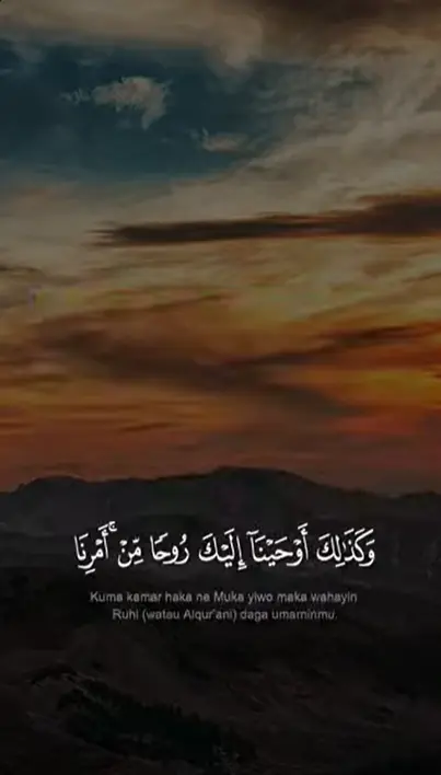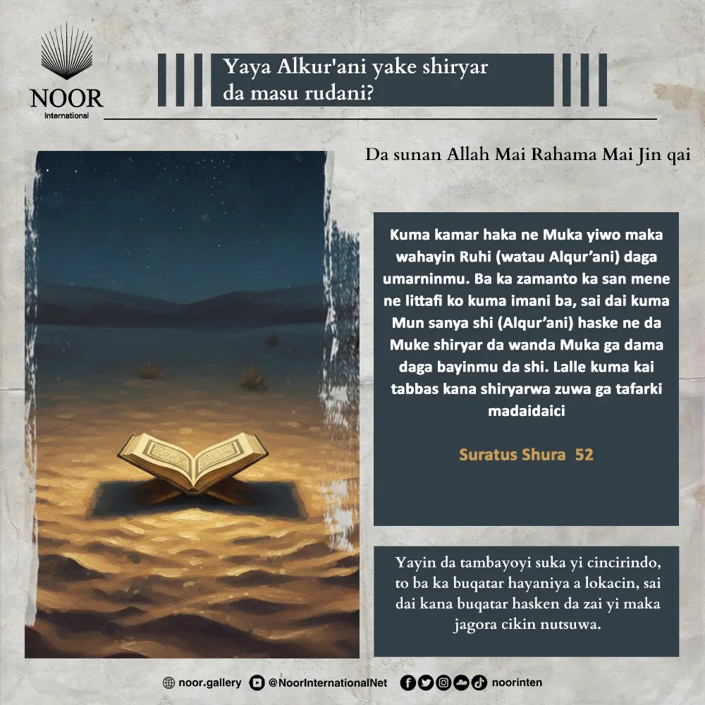 Kuma kamar haka ne Muka yiwo maka wahayin Ruhi (watau Alqur'ani) daga umarninmu. Ba ka zamanto ka san mene ne littafi ko kuma imani ba, sai dai kuma Mun sanya shi (Alqur’ani) haske ne da Muke shiryar da wanda Muka ga dama daga bayinmu da shi. Lalle kuma kai tabbas kana shiryarwa zuwa ga tafarki madaidaici. [Shura: 52]