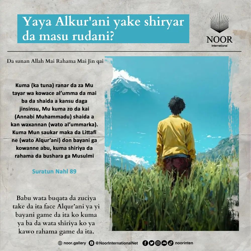 Kuma (ka tuna) ranar da za Mu tayar wa kowace al’umma da mai ba da shaida a kansu daga jinsinsu, Mu kuma zo da kai (Annabi Muhammadu) shaida a kan waxannan (wato al’ummarka). Kuma Mun saukar maka da Littafi ne (wato Alqur’ani) don bayani ga kowanne abu, kuma shiriya da rahama da bushara ga Musulmi. [Nahl: 89]
