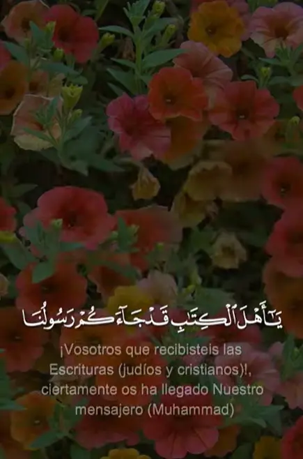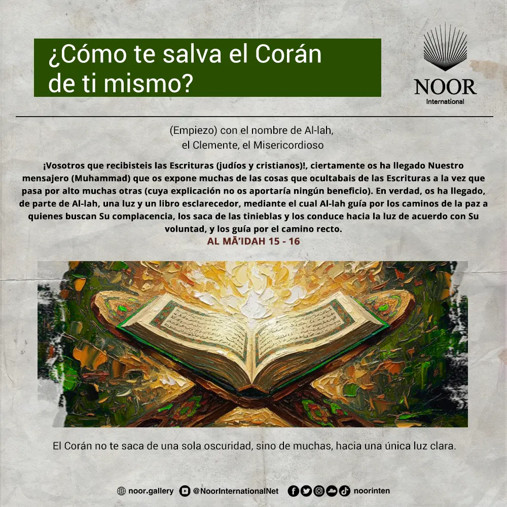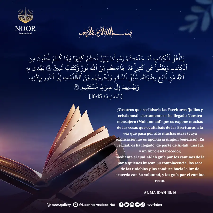 {¡Vosotros que recibisteis las Escrituras (judíos y cristianos)!, ciertamente os ha llegado Nuestro mensajero (Muhammad) que os expone muchas de las cosas que ocultabais de las Escrituras, a la vez que pasa por alto muchas otras (cuya explicación no os aportaría ningún beneficio). En verdad, os ha llegado, de parte de Al-lah, una luz y un libro esclarecedor, mediante el cual Al-lah guía por los caminos de la paz a quienes buscan Su complacencia, los saca de las tinieblas y los conduce hacia la luz de acuerdo con Su voluntad, y los guía por el camino recto.} [Corán 5:15-16]