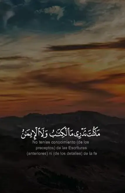 {Y del mismo modo (que concedimos Nuestra revelación a profetas anteriores a ti, ¡oh, Muhammad!) te hemos revelado un Corán que vivifica los corazones y las almas. No tenías conocimiento (de los preceptos) de las Escrituras (anteriores) ni (de los detalles) de la fe; mas hemos hecho del Corán una luz con la que guiamos a quien queremos de entre nuestros siervos. Y tú (¡oh, Muhammad!) guías realmente (a los hombres) hacia el camino recto.} [Corán 42:52]