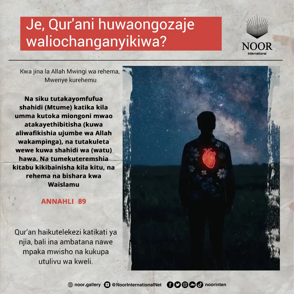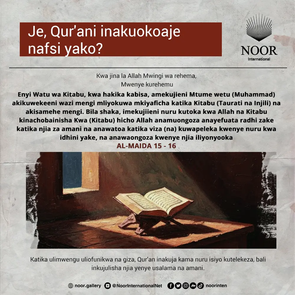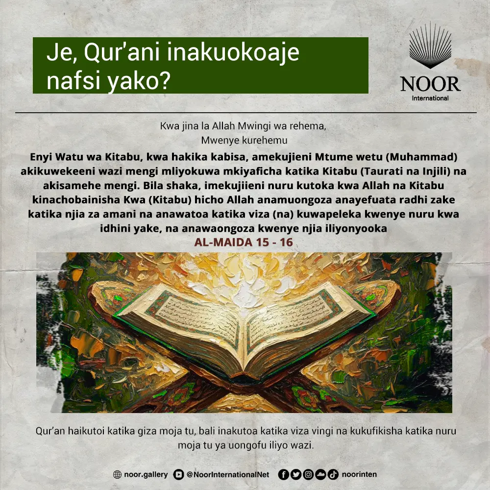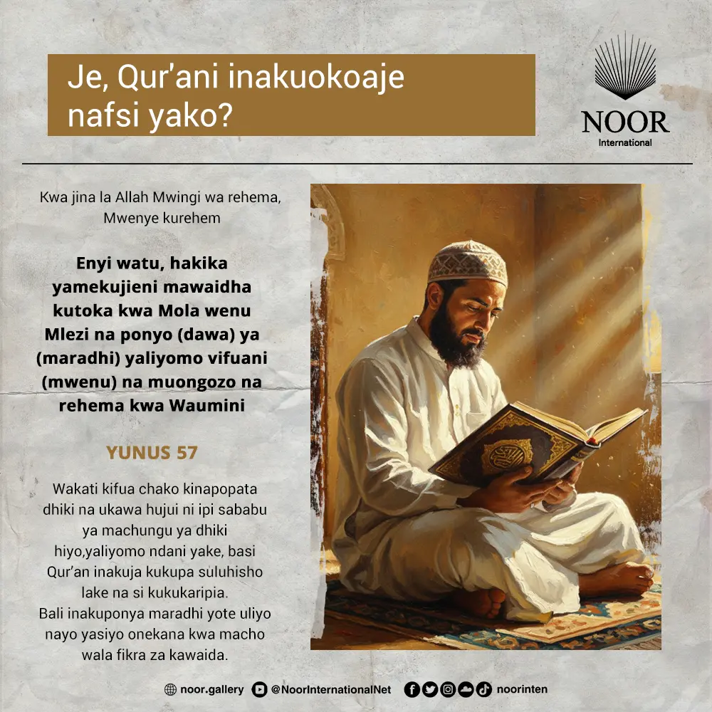 Qur’an si maneno yanayo somwa tu, bali ni mawaidha yanayozindua, na ponyo inayo maliza matatizo, na rahma inayo ulinda moyo wako kwa njia ya upole.