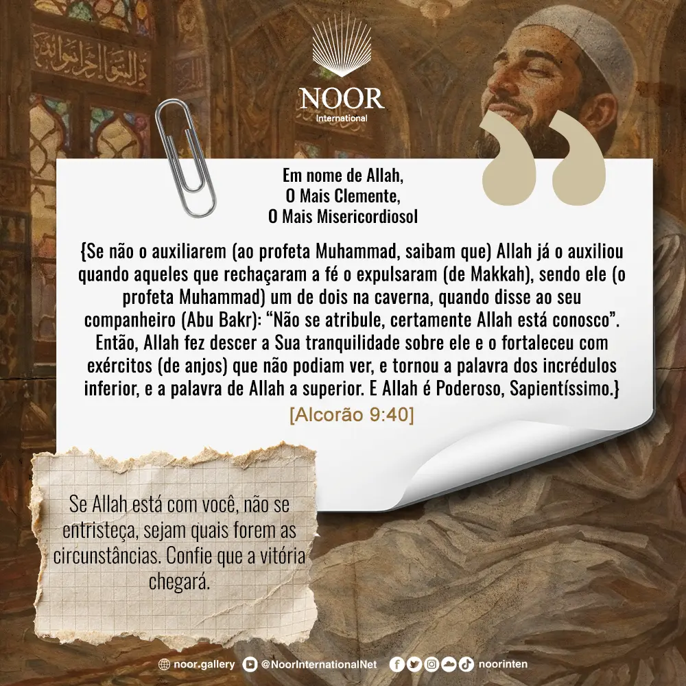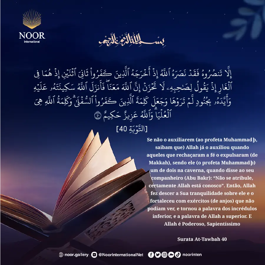 {Se não o auxiliarem (ao profeta Muhammad, saibam que) Allah já o auxiliou quando aqueles que rechaçaram a fé o expulsaram (de Makkah), sendo ele (o profeta Muhammad) um de dois na caverna, quando disse ao seu companheiro (Abu Bakr): “Não se atribule, certamente Allah está conosco”. Então, Allah fez descer a Sua tranquilidade sobre ele e o fortaleceu com exércitos (de anjos) que não podiam ver, e tornou a palavra dos incrédulos inferior, e a palavra de Allah a superior. E Allah é Poderoso, Sapientíssimo.} [Alcorão 9:40]