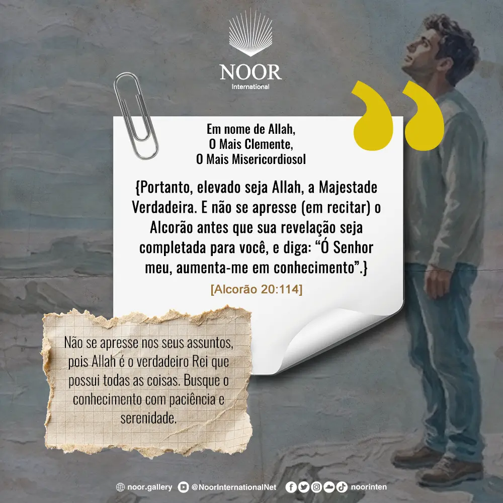 {Portanto, elevado seja Allah, a Majestade Verdadeira. E não se apresse (em recitar) o Alcorão antes que sua revelação seja completada para você, e diga: “Ó Senhor meu, aumenta-me em conhecimento”.} [Alcorão 20:114]