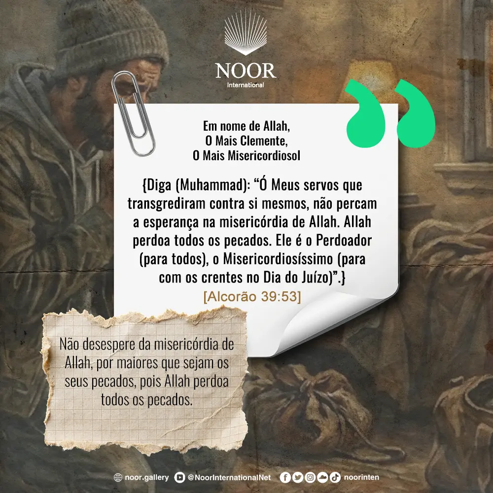 Não desespere da misericórdia de Allah, por maiores que sejam os seus pecados, pois Allah perdoa todos os pecados.