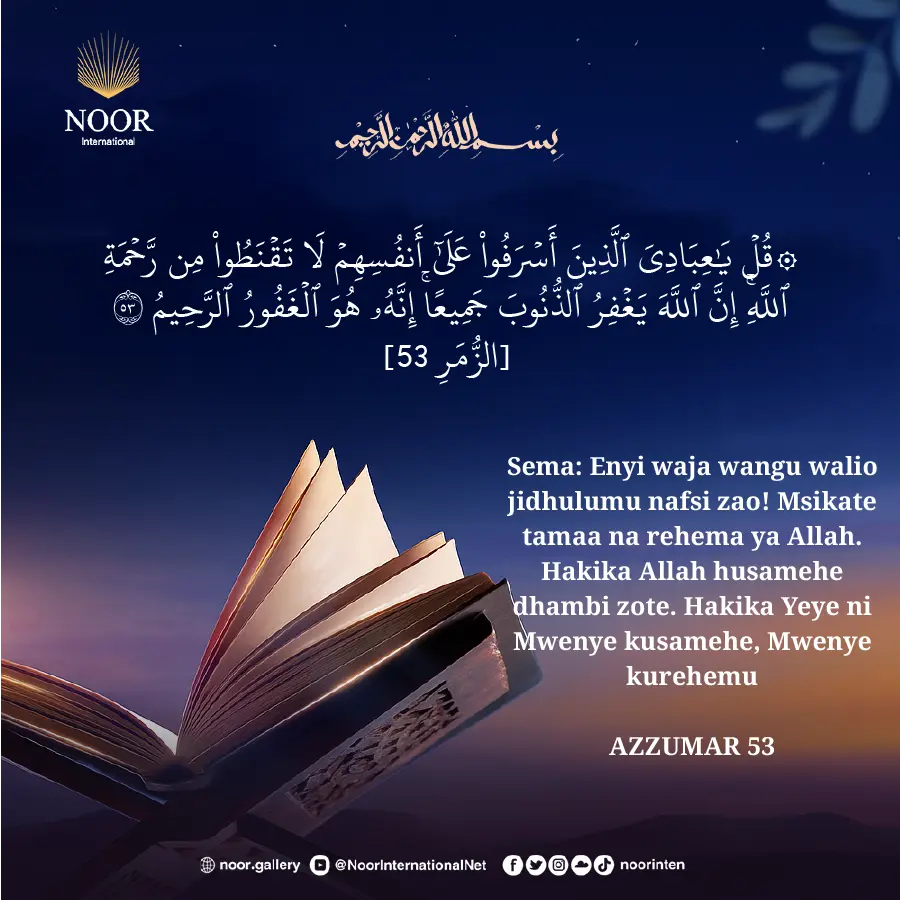 Vyovyote itakavyo kuwa umeichafua nafsi yako kwa madhambi, kumbuka kuwa mlango wa rehema za Allah upo wazi daima. Basi usikate tamaa, kwani Allah ni Mwenye kusamehe na Mwenye huruma.