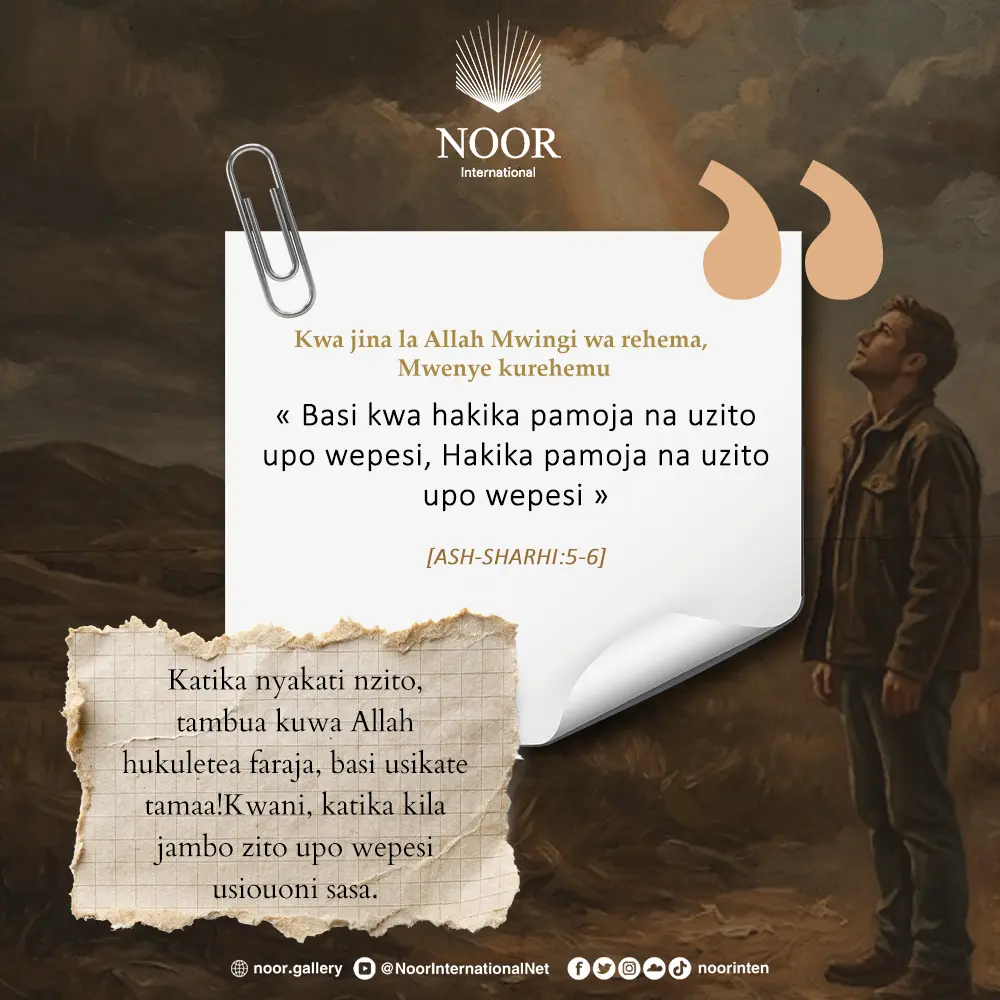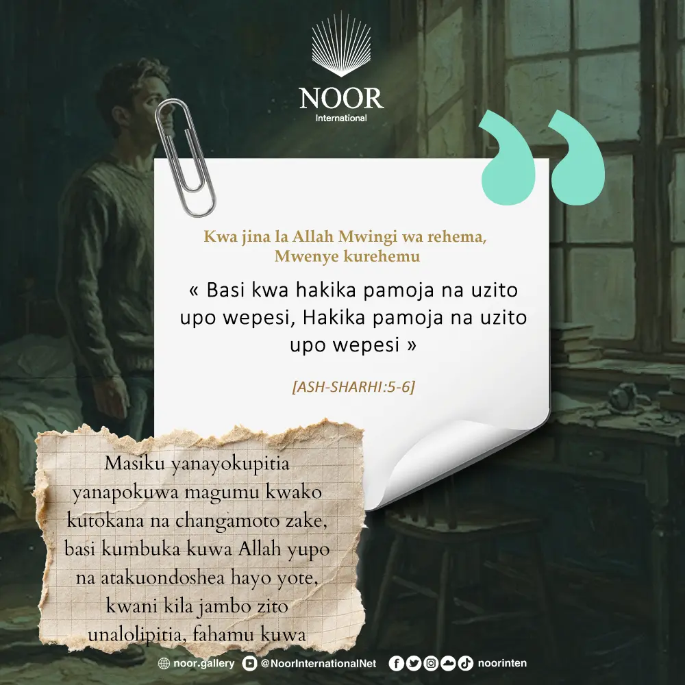 Masiku yanayokupitia yanapokuwa magumu kwako kutokana na changamoto zake, basi kumbuka kuwa Allah yupo na atakuondoshea hayo yote, kwani kila jambo zito unalolipitia, fahamu kuwa hufuatiwa na wepesi.