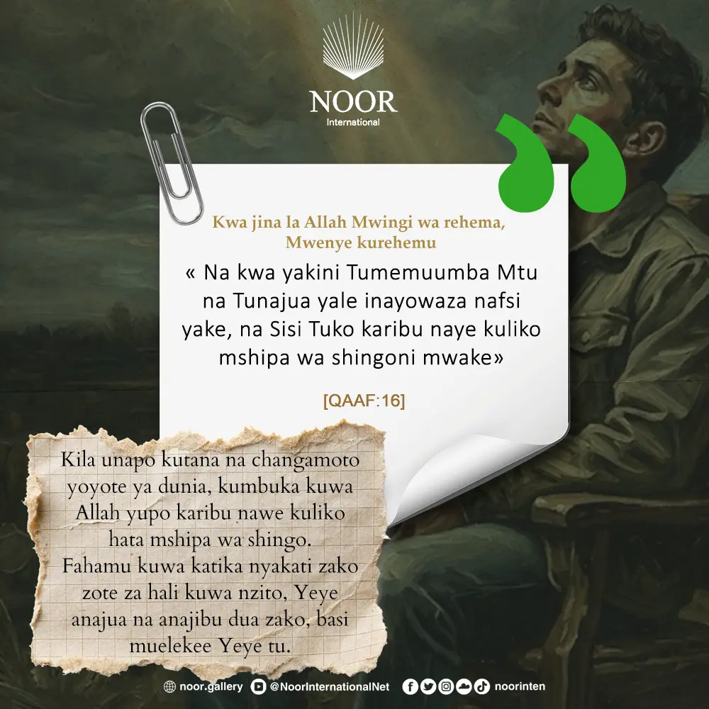 Kila unapo kutana na changamoto yoyote ya dunia, kumbuka kuwa Allah yupo karibu nawe kuliko hata mshipa wa shingo.
