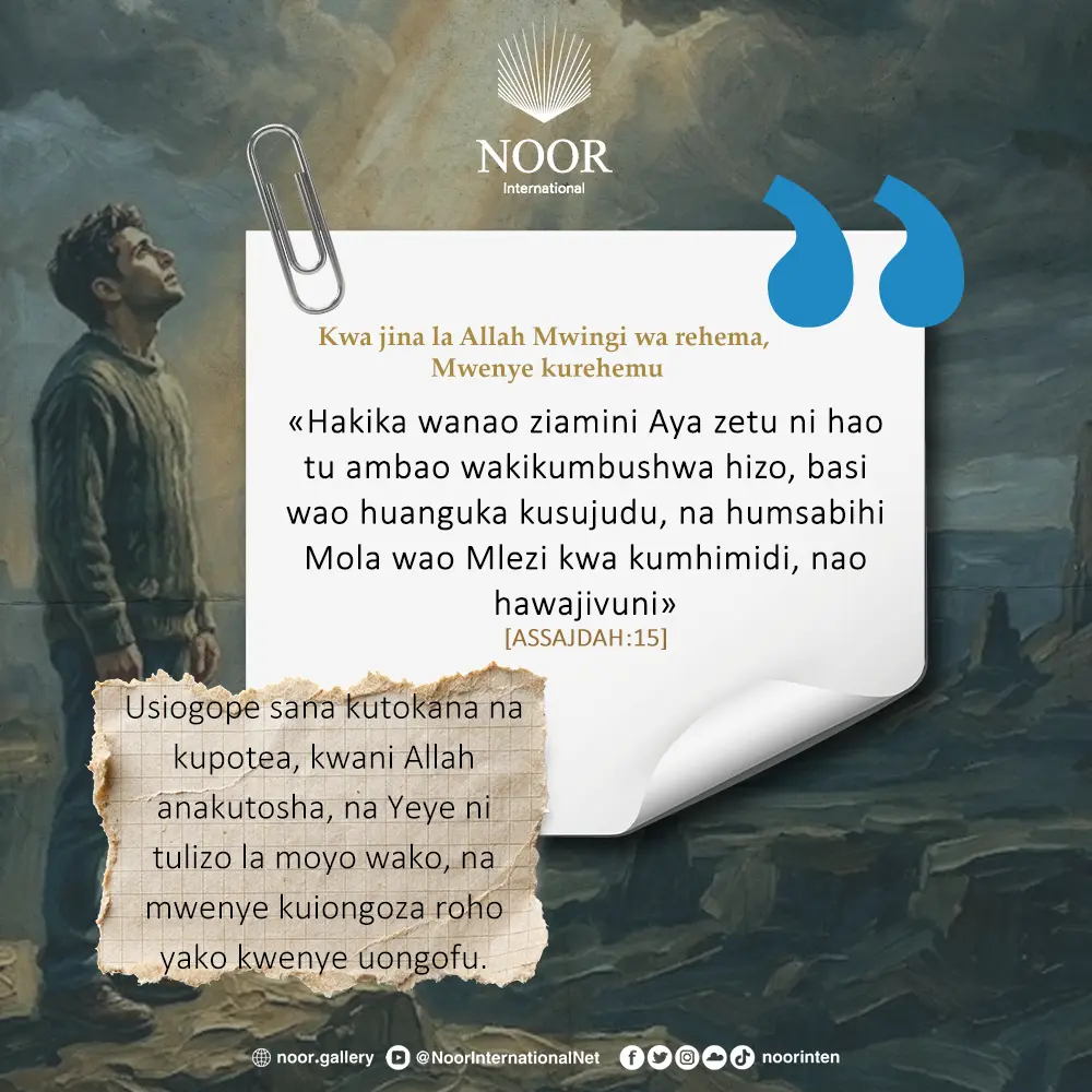 Allah yupo karibu nawe kuliko nafsi yako, anajua yote yaliyomo moyoni mwako na katika fikra zako, usiogope, kwani Yeye yupo pamoja nawe kila wakati.