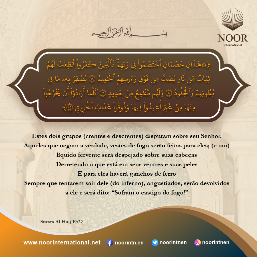 Disse (Allah): “Desçam ambos daqui, como inimigos uns dos outros. E se chegar até vocês uma orientação da Minha parte, (saibam que) quem seguir a Minha orientação não se desviará nem sofrerá””“E aquele que se afastar da Minha lembrança (revelação), terá certamente uma vida miserável e o ressuscitaremos, no dia da ressurreição, cego”Ele (o ressuscit...