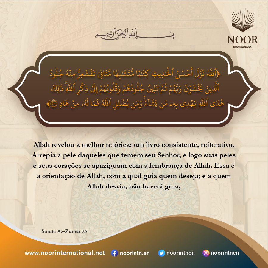 Allah revelou a melhor retórica: um livro consistente[1],reiterativo[2]. Arrepia a pele daqueles que temem seu Senhor, e logo suas peles e seus corações se apaziguam com a lembrança de Allah. Essa é a orientação de Allah, com a qual guia quem deseja; e a quem Allah desvia, não haverá guia,