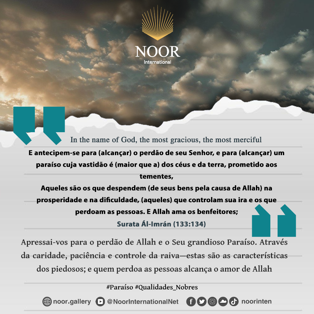 "Apressai-vos para o perdão de Allah e o Seu grandioso Paraíso. Através da caridade, paciência e controle da raiva—estas são as características dos piedosos; e quem perdoa as pessoas alcança o amor de Allah." #Paraíso #Qualidades_Nobres