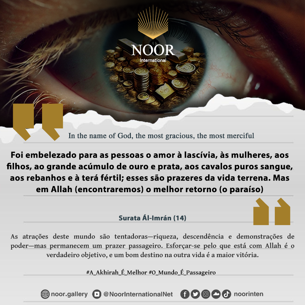 "As atrações deste mundo são tentadoras—riqueza, descendência e demonstrações de poder—mas permanecem um prazer passageiro. Esforçar-se pelo que está com Allah é o verdadeiro objetivo, e um bom destino na outra vida é a maior vitória." #A_Akhirah_É_Melhor #O_Mundo_É_Passageiro