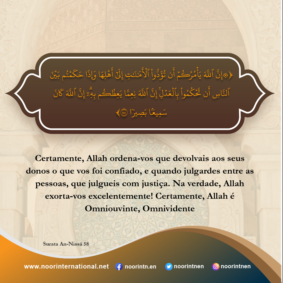 Certamente Allah ordena a vocês que devolvam a seus donos o que lhes foi confiado e, quando julgarem entre as pessoas, que julguem com justiça. Na verdade, Allah os exorta excelentemente! Certamente, Allah é Oniouvinte, Onividente
