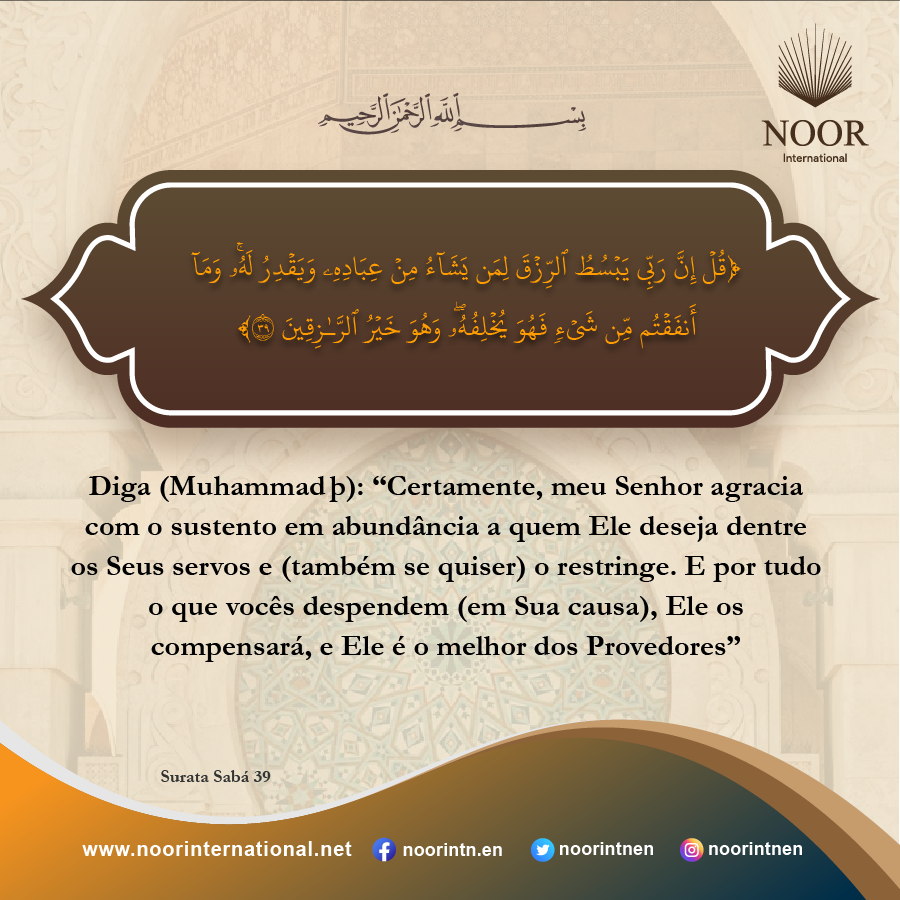 Diga (Muhammad þ): “Certamente, meu Senhor agracia com o sustento em abundância a quem Ele deseja dentre os Seus servos e (também se quiser) o restringe. E por tudo o que vocês despendem (em Sua causa), Ele os compensará, e Ele é o melhor dos Provedores”