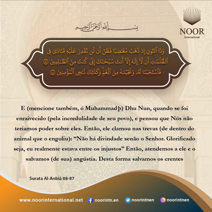 E (mencione também, ó Muhammad þ) Dhu Nun, quando se foi enraivecido (pela incredulidade de seu povo), e pensou que Nós não teríamos poder sobre eles. Então, ele clamou nas trevas (de dentro do animal que o engoliu): “Não há divindade senão o Senhor. Glorificado seja, eu realmente estava entre os injustos”