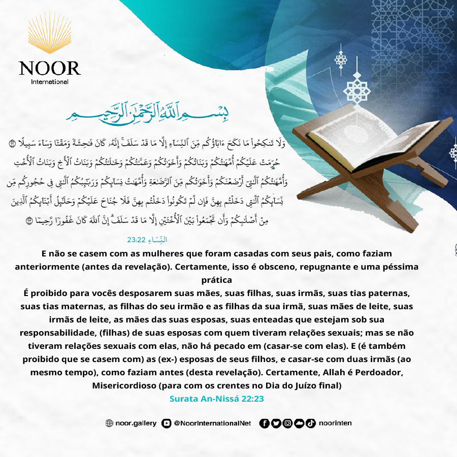 É proibido para vocês desposarem suas mães , suas filhas , suas irmãs, suas tias paternas, suas tias maternas, as filhas do seu irmão e as filhas da sua irmã, suas mães de leite, suas irmãs de leite, as mães das suas esposas, suas enteadas que estejam sob sua responsabilidade, (filhas) de suas esposas com quem tiveram relações sexuais; mas se não tiveram relações sexuais com elas, não há pecado em (casar-se com elas). E (é também proibido que se casem com) as (ex-) esposas de seus filhos, e casar-se com duas irmãs (ao mesmo tempo), como faziam antes (desta revelação). Certamente, Allah é Perdoador, Misericordioso (para com os crentes no Dia do Juízo final)