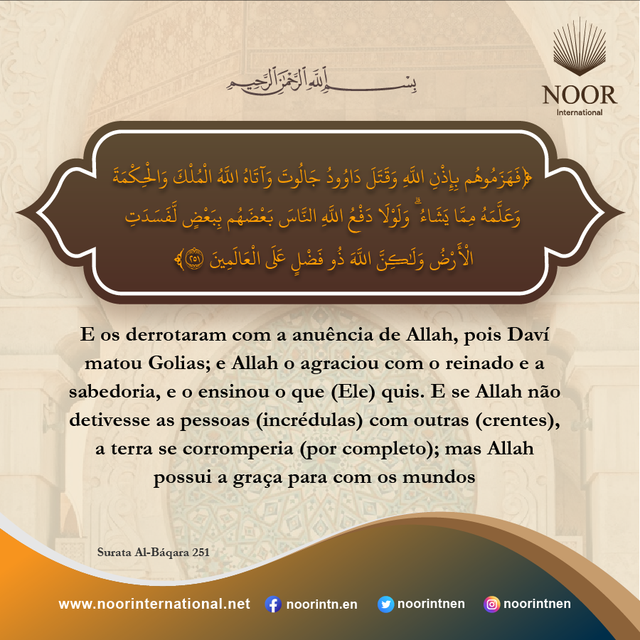 E os derrotaram com a anuência de Allah, pois Daví matou Golias; e Allah o agraciou com o reinado e a sabedoria, e o ensinou o que (Ele) quis.