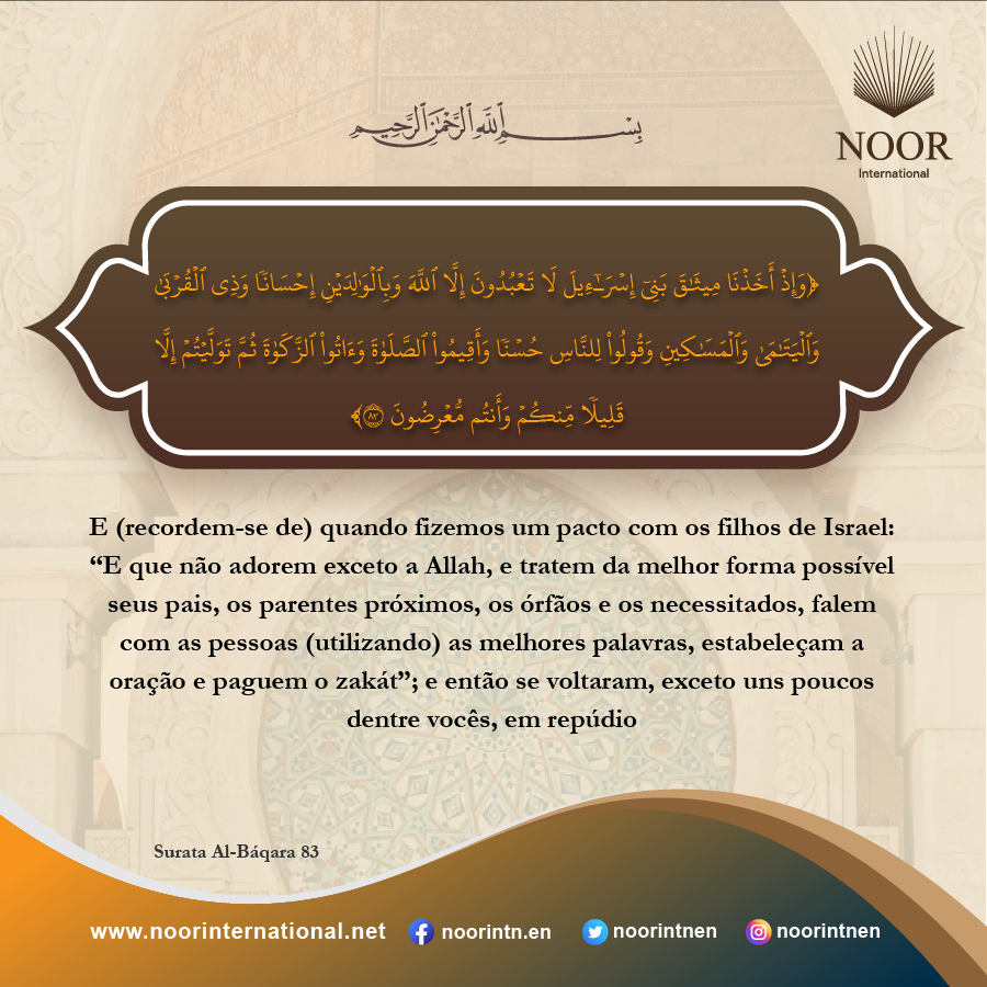 E (recordem-se de) quando fizemos um pacto com os filhos de Israel: “E que não adorem exceto a Allah, e tratem da melhor forma possível seus pais, os parentes próximos, os órfãos e os necessitados, falem com as pessoas (utilizando) as melhores palavras, estabeleçam a oração e paguem o zakát”; e então se voltaram, exceto uns poucos dentre vocês, em repúdio