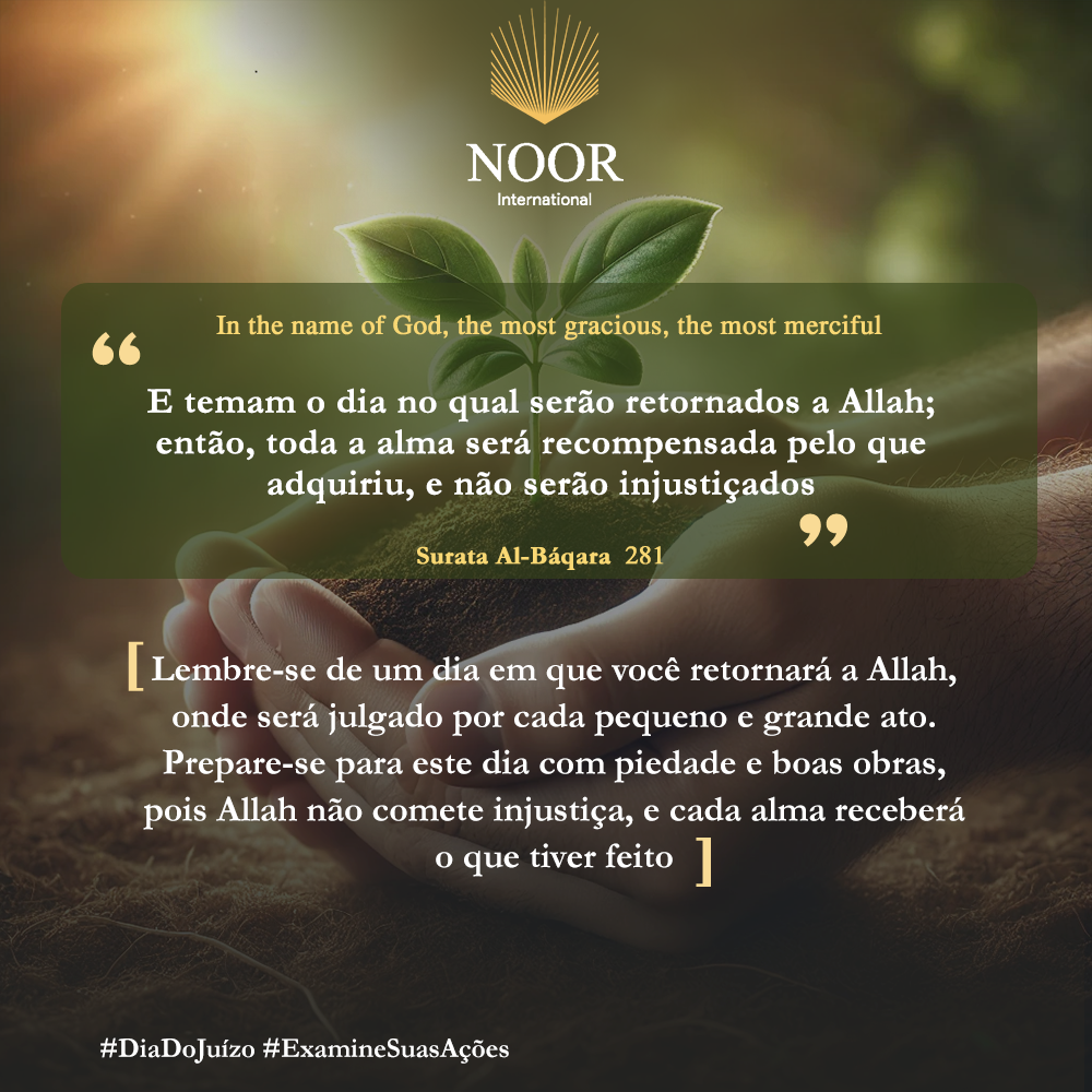 "Lembre-se de um dia em que vós retornareis a Allah, onde sereis julgado por cada pequeno e grande ato. Prepare-se para este dia com piedade e boas obras, pois Allah não comete injustiça, e cada alma receberá o que tiver feito." #DiaDoJuízo #ExamineSuasAções