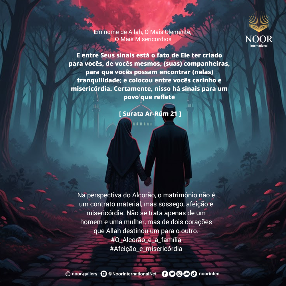 Na perspectiva do Alcorão, o matrimônio não é um contrato material, mas sossego, afeição e misericórdia. Não se trata apenas de um homem e uma mulher, mas de dois corações que Allah destinou um para o outro.