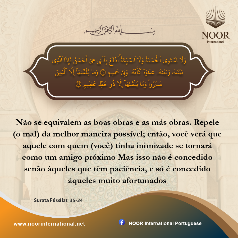 Não se equivalem as boas obras e as más obras. Repele (o mal) da melhor maneira possível; então, você verá que aquele com quem (você) tinha inimizade se tornará como um amigo próximoMas isso não é concedido senão àqueles que têm paciência, e só é concedido àqueles muito afortunados