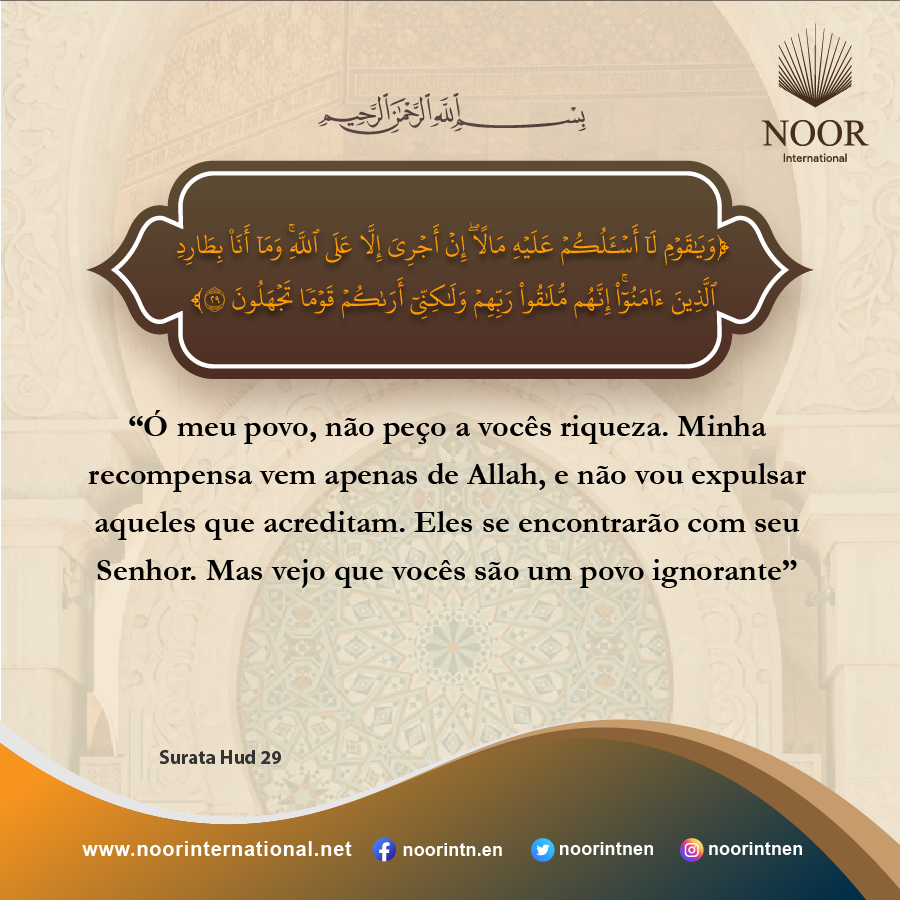 “Ó meu povo, não peço a vocês riqueza. Minha recompensa vem apenas de Allah, e não vou expulsar aqueles que acreditam[1]. Eles se encontrarão com seu Senhor. Mas vejo que vocês são um povo ignorante”