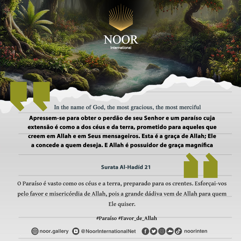 O Paraíso é vasto como os céus e a terra, preparado para os crentes. Esforçai-vos pelo favor e misericórdia de Allah, pois a grande dádiva vem de Allah para quem Ele quiser." #Paraíso #Favor_de_Allah